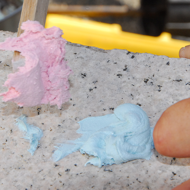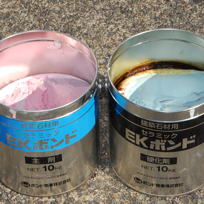 耐震用ボンドの1剤と2剤を混ぜ合わせ、墓石の接合面を固定します。