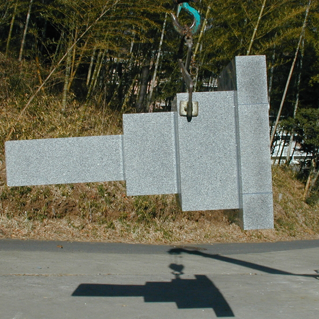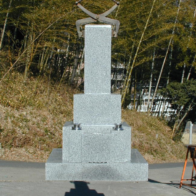 お墓を、斜め・横に倒し、更に上部から吊り下げを行い、どのような力がかかっても分離しないことを確認します。